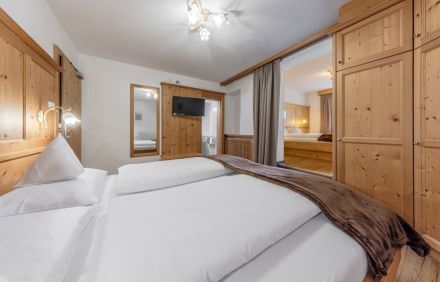 Our family rooms in the heart of San Cassiano are available in two versions. The Family Room with about 25 m² has a bedroom with a double bed and a bedroom with a single bed, large bathroom with shower and balcony with a view. The Superior Family Room is 35 m² with private balcony, 2 bedrooms with double bed, both with bathroom and shower. Like all our rooms, it has a flat-screen TV, hairdryer and safe.